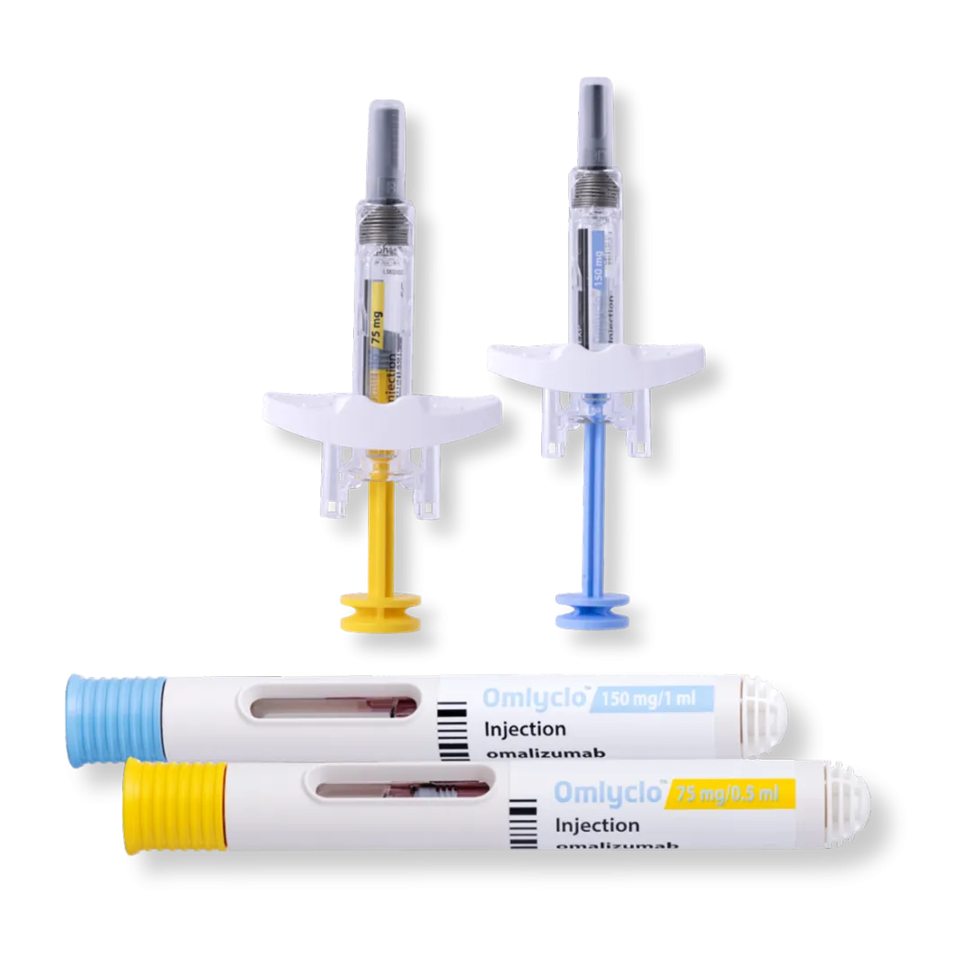 PRESENTACIÓN, CÓDIGO NACIONAL Y PRECIO. OmlycloTM 150 mg solucion inyectable en jeringa precargada, 1 jeringa precargada de 1 ml; CN: 765686. Precio notificado PVL: 369,27€, PVP: 420,18€, PVP (IVA): 436,99€. OmlycloTM 150 MG solucion inyectable en pluma precargada, 2 plumas precargadas de 1 ml; CN: 768502. Precio notificado PVL: 738,54€, PVP: 794,45€, PVP (IVA): 826,23€. REGIMEN DE PRESCRIPCIÓN Y DISPENSACIÓN. Medicamento sujeto a pres­cripción médica. Diagnóstico hospitalario. CONDICIONES DE LA PRESTACIÓN FARMACÉUTICA DEL SISTEMA NACIONAL DE SALUD. Financiado por SNS. La información detallada de este medicamento está disponible en la página web de la Agencia Española de Medicamentos y Productos Sanitarios (AEMPS) ht­tps://www.aemps.gob.es